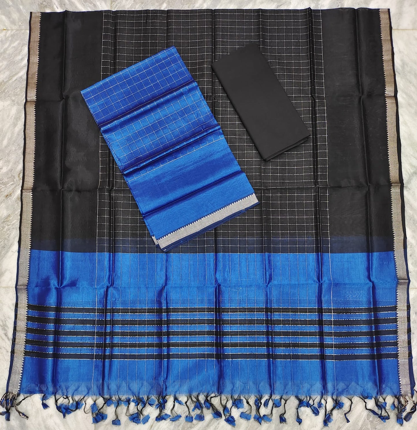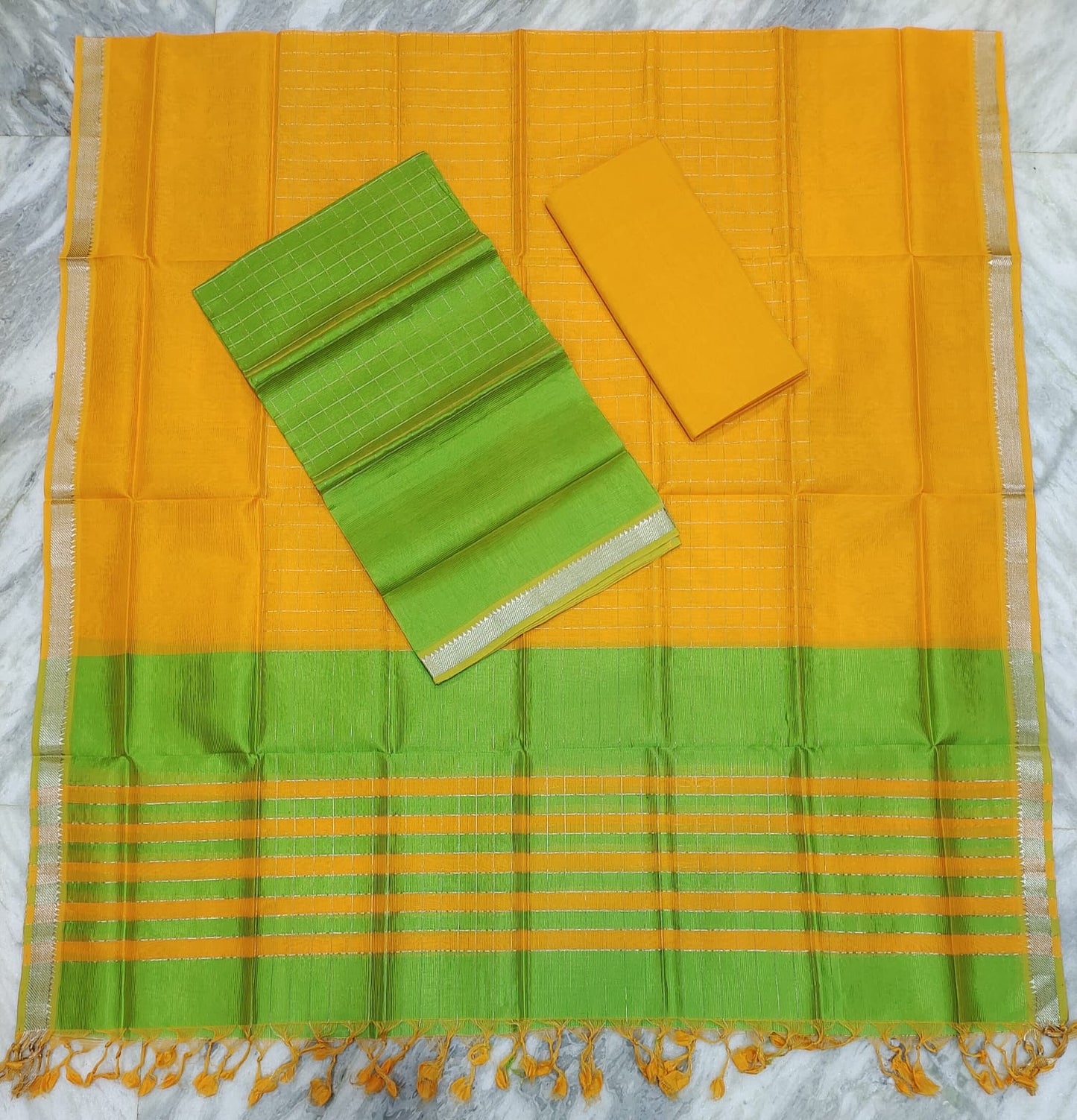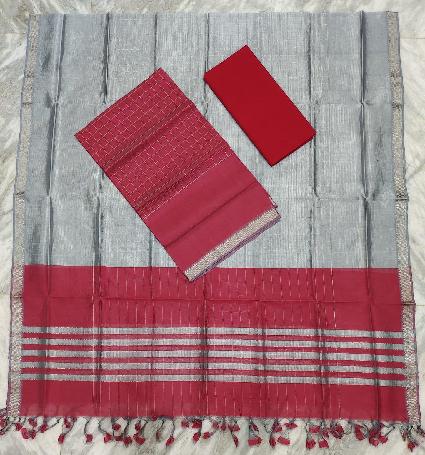 Top: contrast color plain top with silver zari border & silver zari middle check 2.5 meters