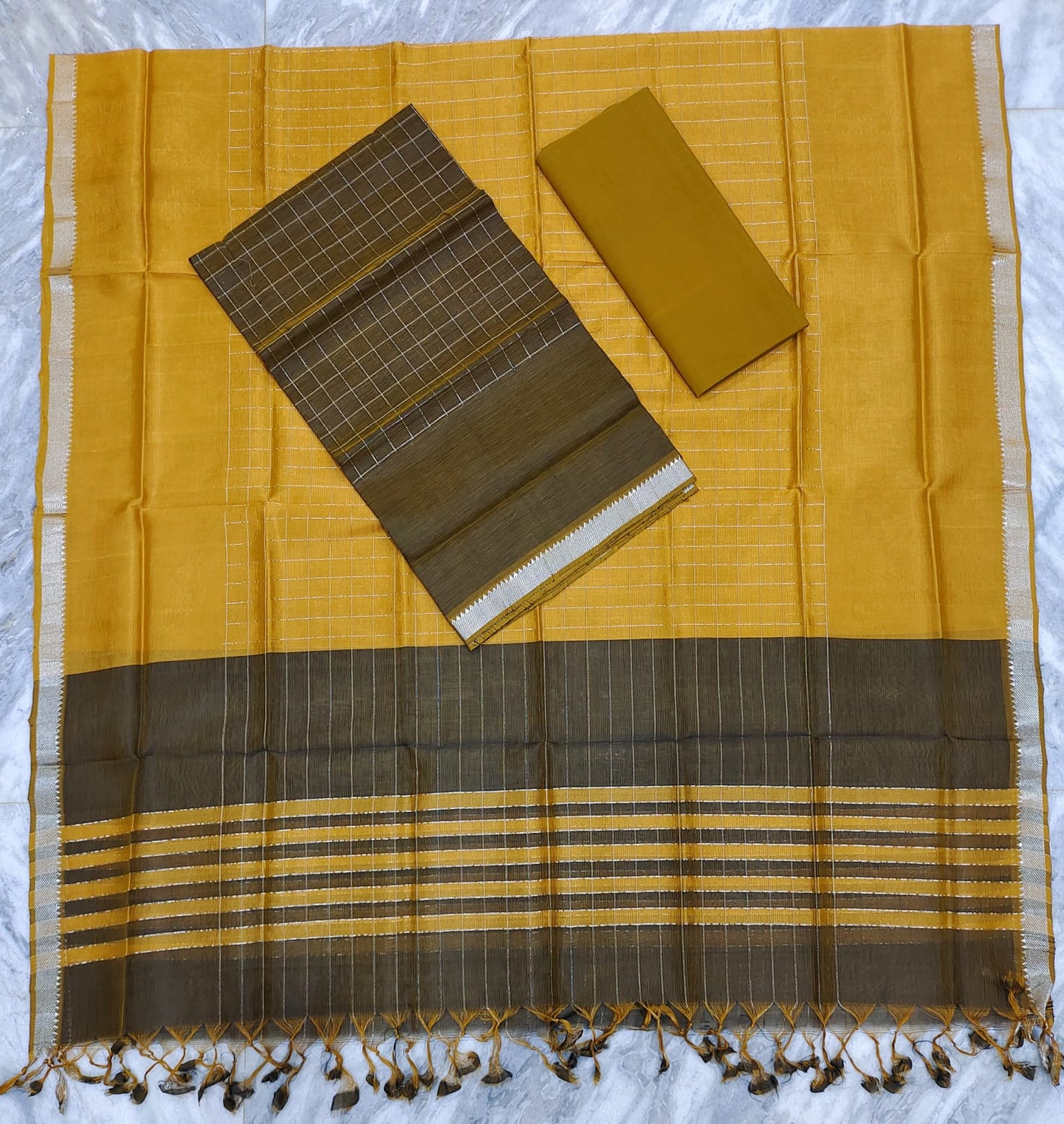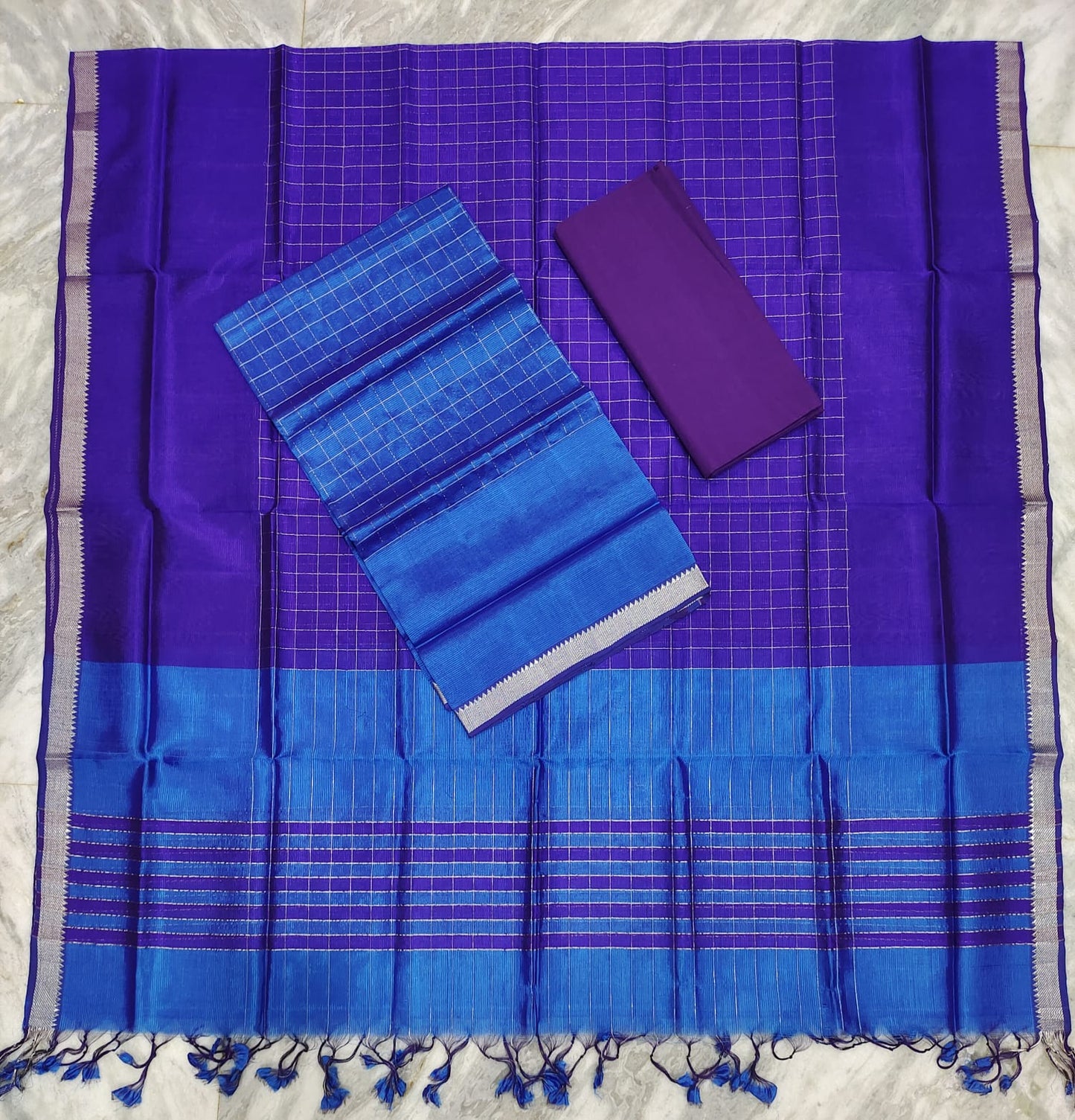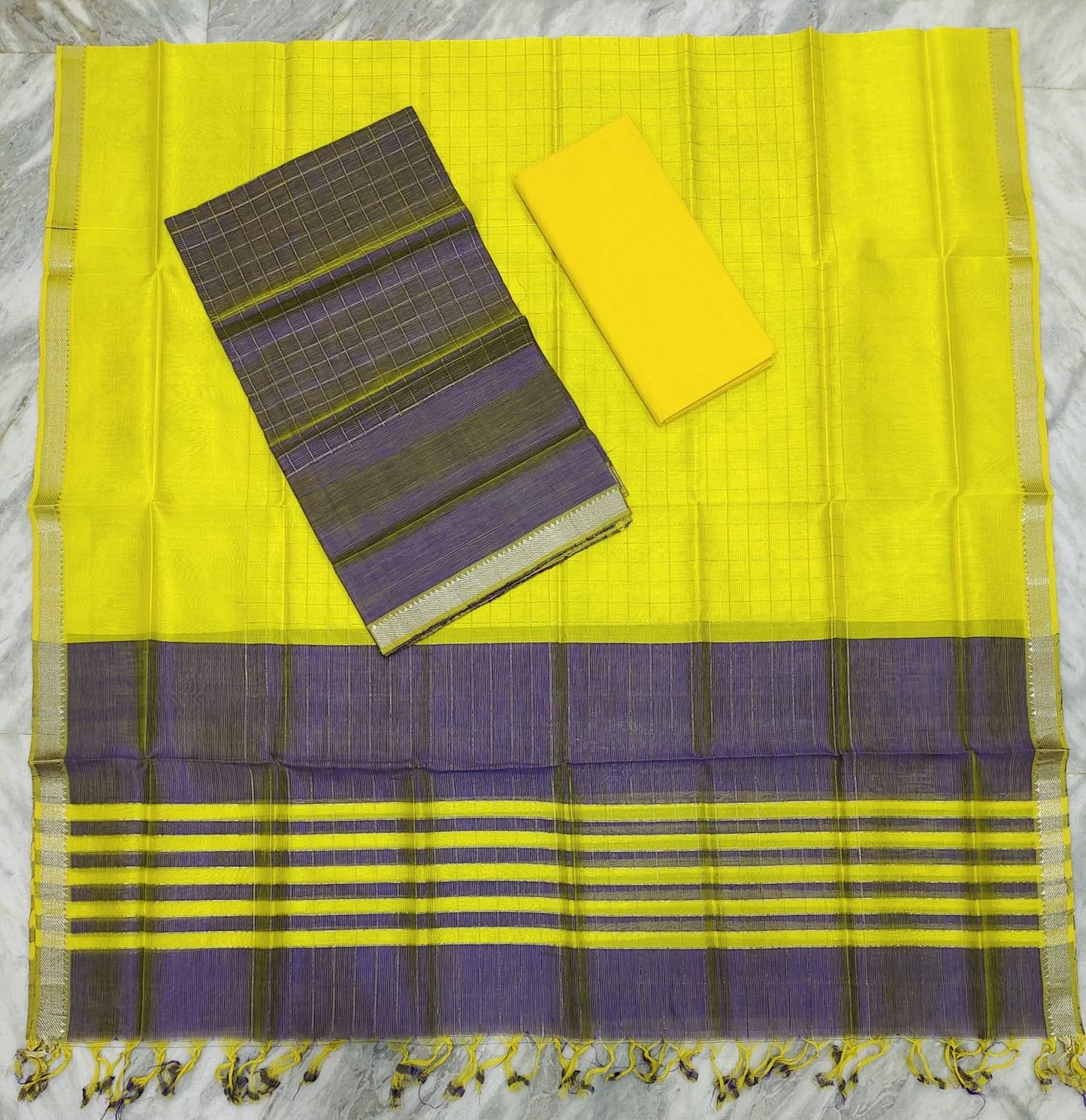 Top: contrast color plain top with silver zari border & silver zari middle check 2.5 meters